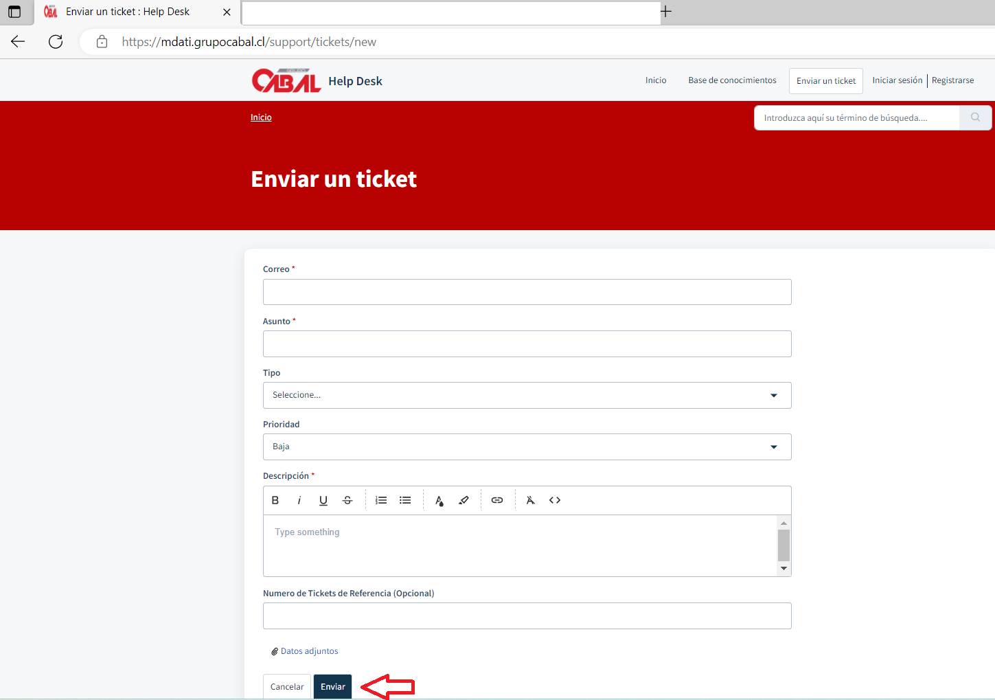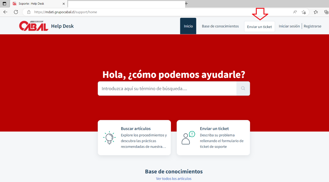 Para crear un nuevo ticket, ingresa a mdati.grupocabal.cl desde cualquier dispositivo (notebook, Tablet, celular, etc) y presiona “Enviar un ticket”.
